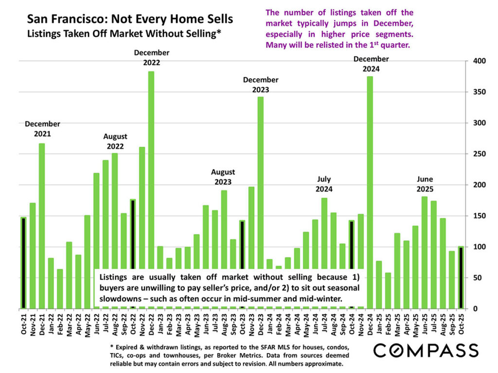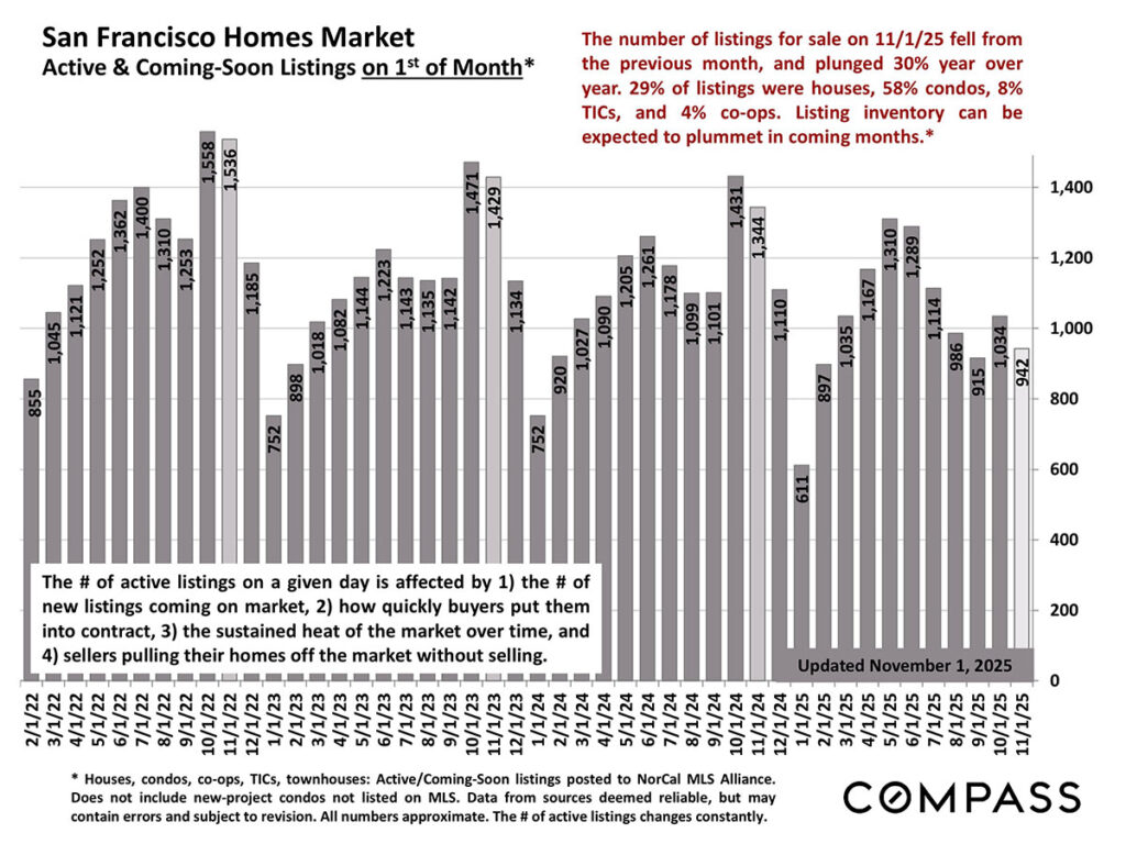 Listings for sale as of November 1 were down 30% from the previous year. 29% of the listings were houses, 58% condos, 8% TICs, and 4% co-ops.