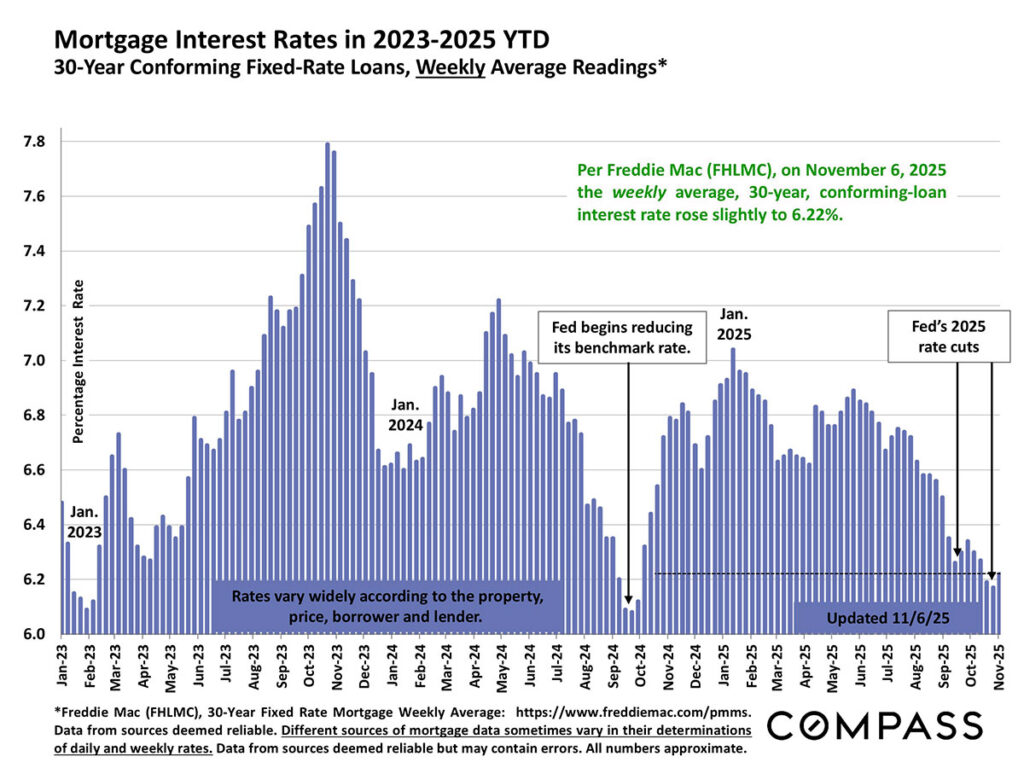 As of November 6, 2025, the weekly, average 30-year conforming loan interest rate rose slightly to 6.22%.