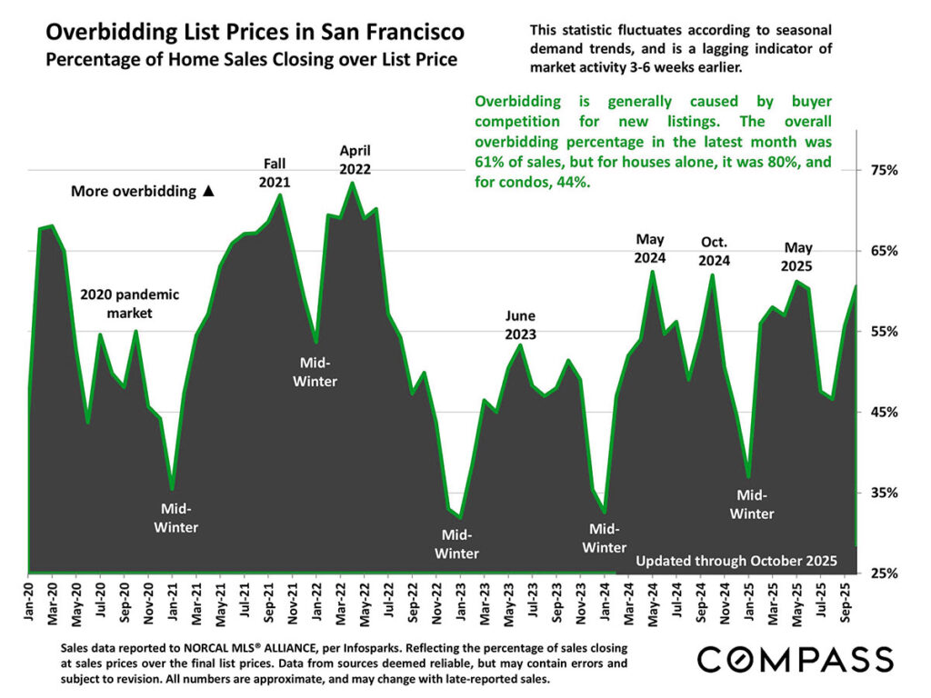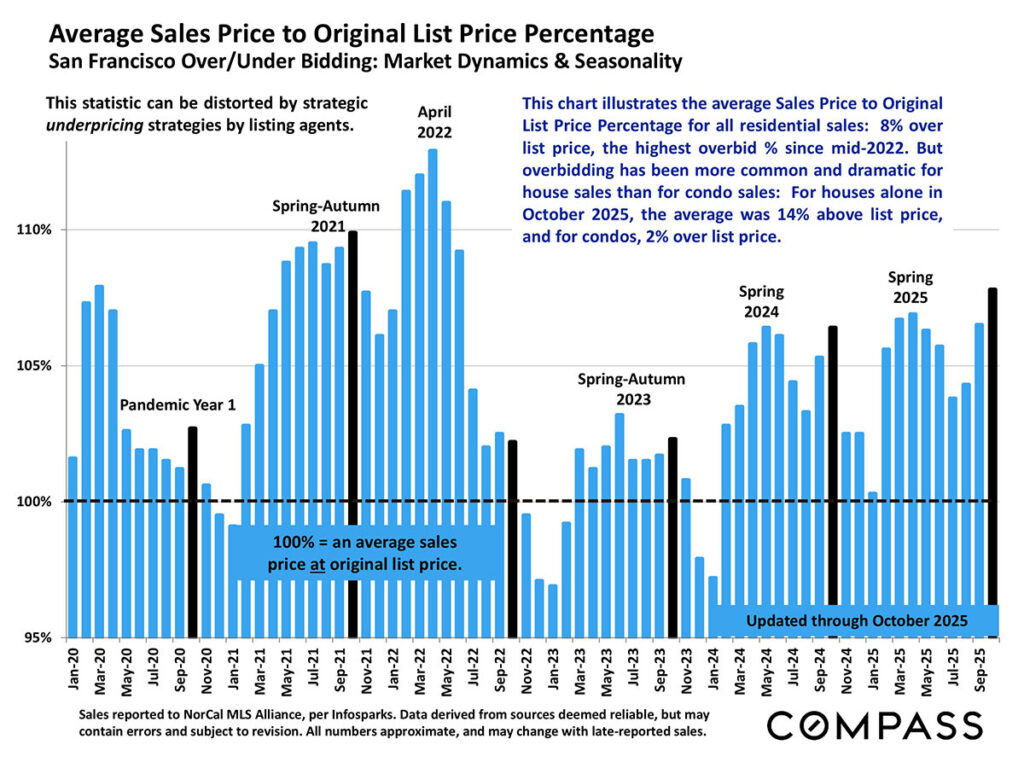 The average sales price to original list price for all residential sales was 8%, the highest since mid-2022. For houses alone in October, the average was 14% above list price and for condos it was 2% over list price.