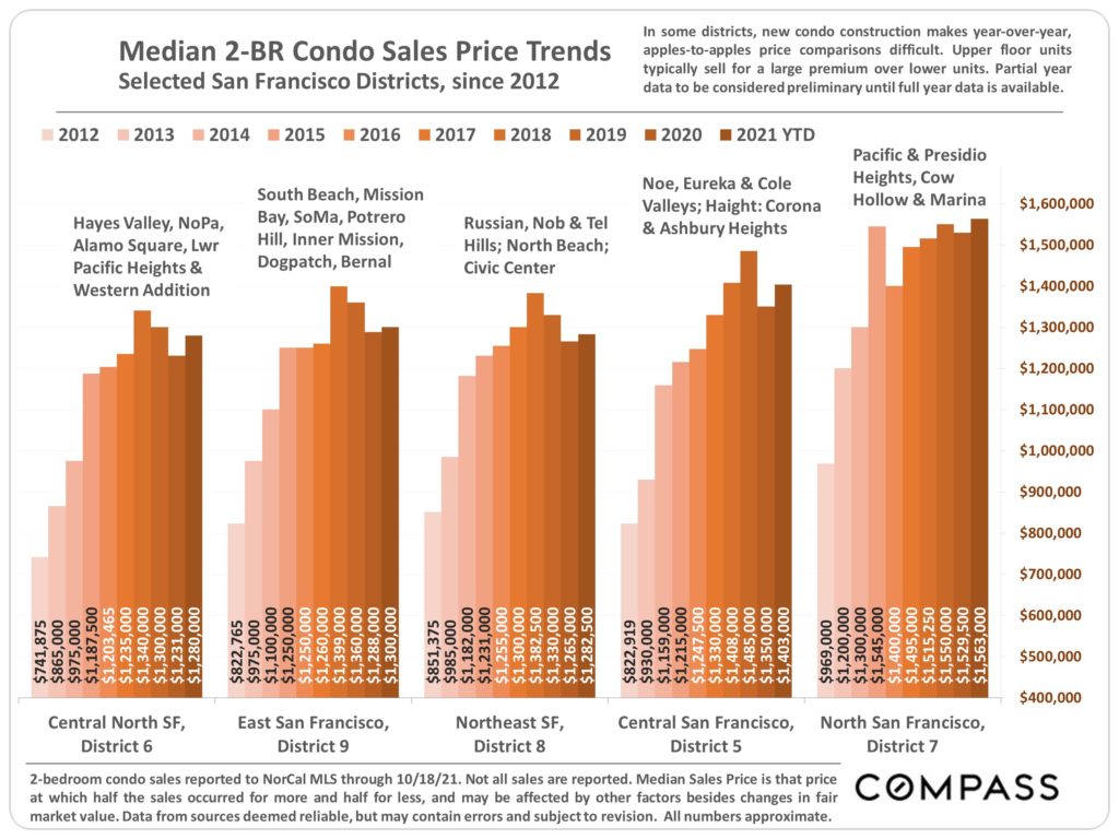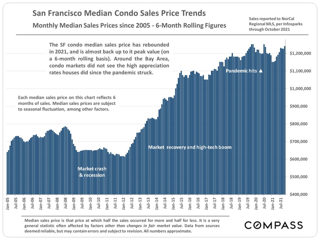 Condo median sales prices have rebounded this year, and are almost back up to their peak value. Overall, median sales prices for condos did not have the same high appreciation rates houses have seen since the pandemic started, but they are trending upwards.