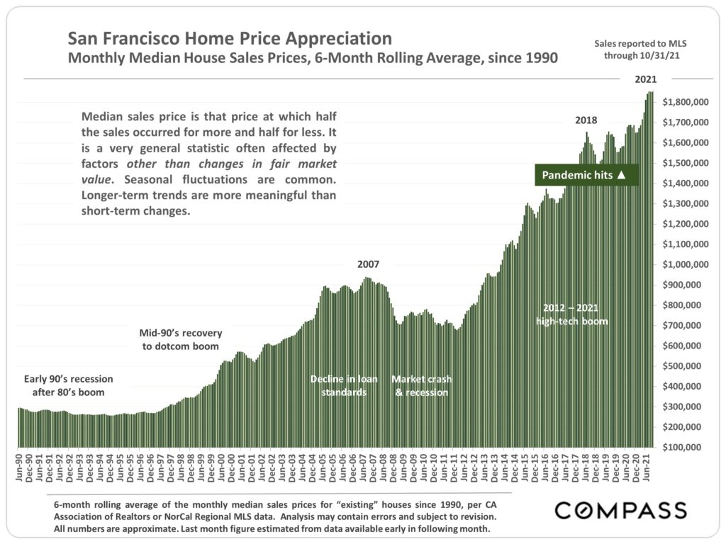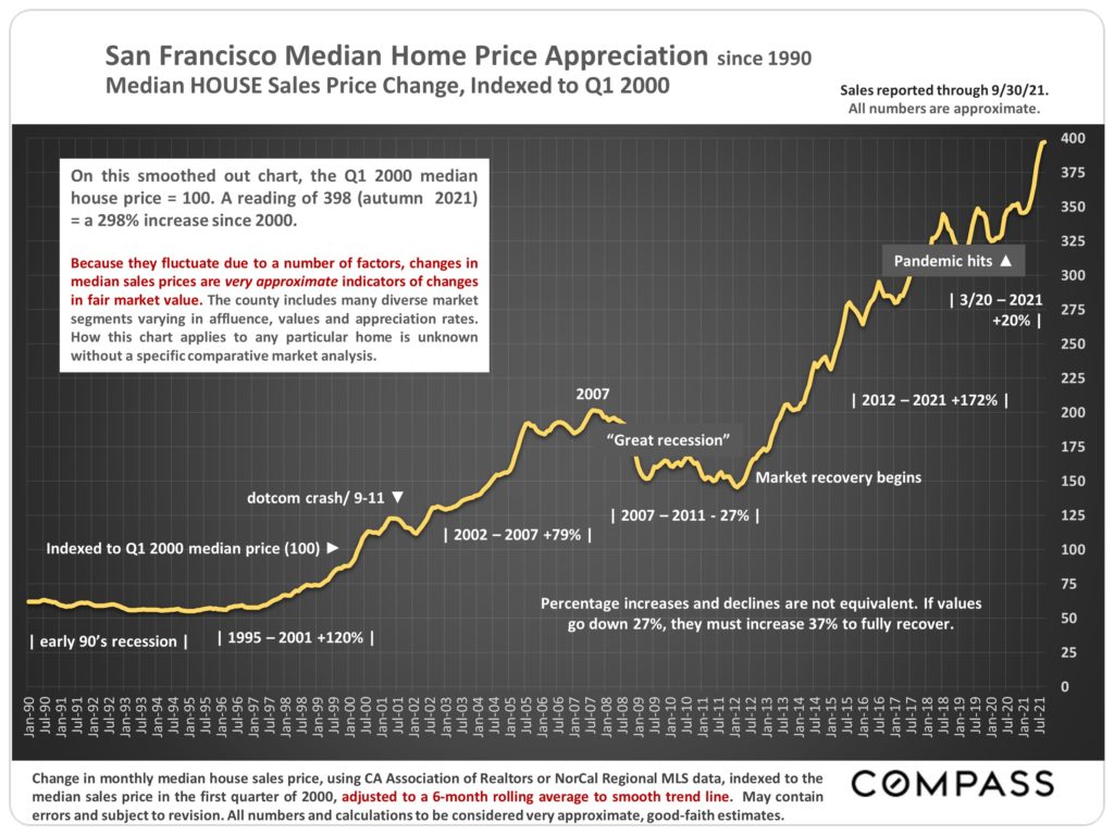 The following chart illustrates house price appreciation indexed to the first quarter of 2000 (equal to 100 on the chart); for example, the fall 2021 reading of 398 reflects a 298% increase since the indexed year of 2000.