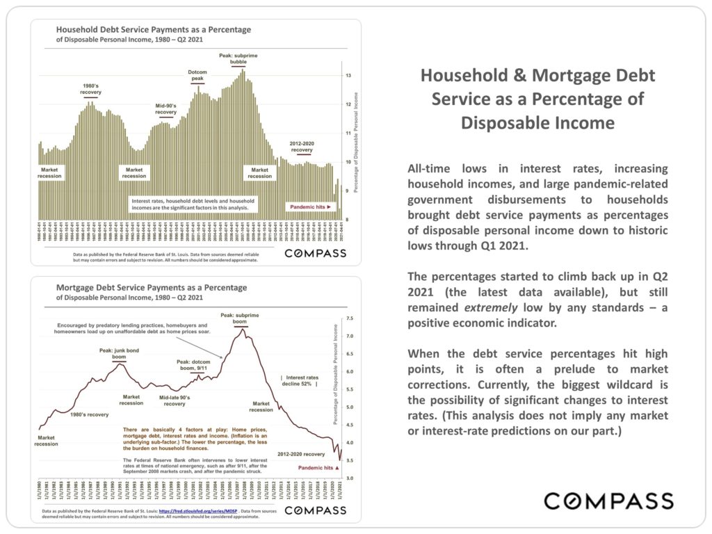 A positive economic indicator is the low level of debt service payments as percentages of disposable income, which dropped to historic lows through the first quarter of 2021. Those rates started to increased in Q2 2021, but remained exceptionally low.
